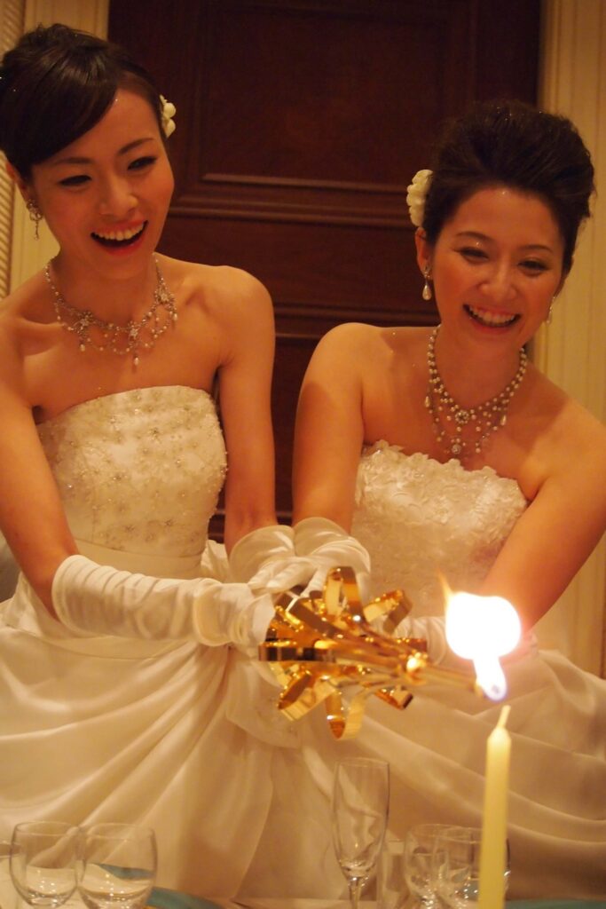 東小雪さんは、私生活ではタキシード姿ではなく、2人ともにウェディングドレス姿でした。