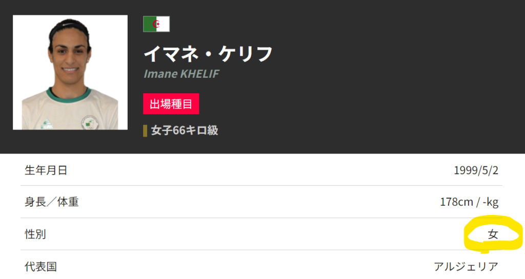 では、イマネケリフ選手のプロフィールを見てみましょう。