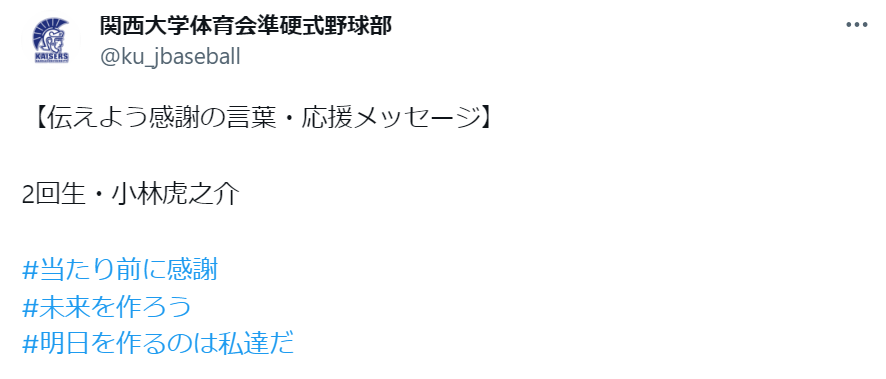 同姓同名の小林虎之介さんは、同高校から関西大学に進んで野球部で活躍されているようです。