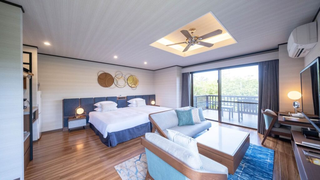 - 同ホテルの50平米のコテージへ案内され大きなベッドが1つあった
