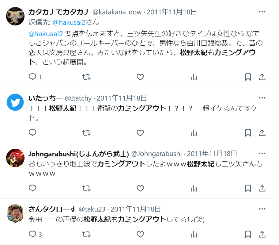 上記の情報をもとに調べていくと、上記の投稿の前日の2011年の11月17日に、松野さんのアカウントに以下のような投稿がありました。