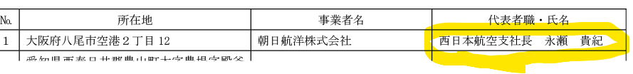 2013年、八尾空港内の朝日航洋に「永瀬貴紀」という人物がいたことがわかります。