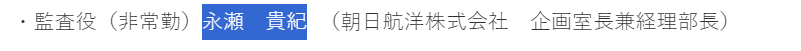 「永瀬貴紀」という人物が、朝日航洋の企画室長兼経理部長から、北海道朝日航洋の監査役になったと記されています。