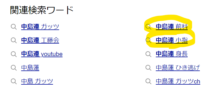 中島蓮さんを調べると、「前科」や「小指}という検索ワードも出てきます。