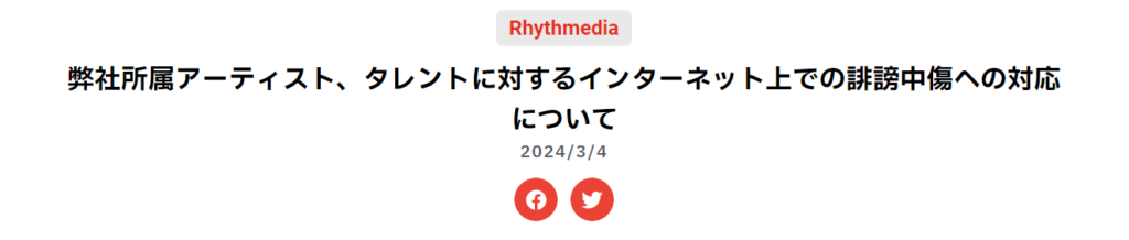 弊社は所属アーティストやその関係者が健やかに活動を行うことができますよう、節度を越えた表現につきましては顧問弁護士と協議のうえ、法的措置を視野に入れた対応を行う方針です。