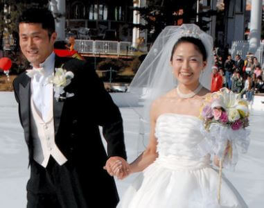 スケートリンクでウェディングドレスは、普通の人にはなかなか難しい姿です。