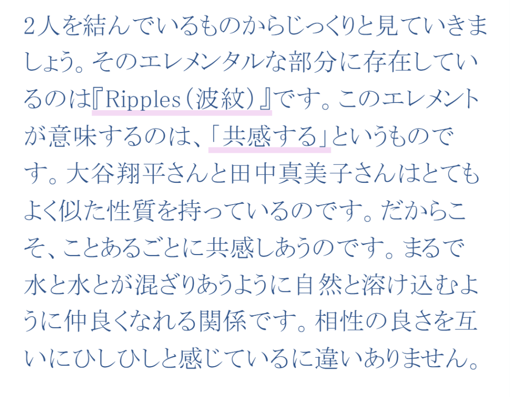 2人を結んでいるものからじっくりと見ていきましょう。そのエレメンタルな部分に存在しているのは『Ripples(波紋)』です。このエレメントが意味するのは、「共感する」というものです。大谷翔平さんと田中真美子さんはとてもよく似た性質を持っているのです。だからこそ、ことあるごとに共感しあうのです。まるで水と水とが混ざりあうように自然と溶け込むように仲良くなれる関係です。相性の良さを互いにひしひしと感じているに違いありません。