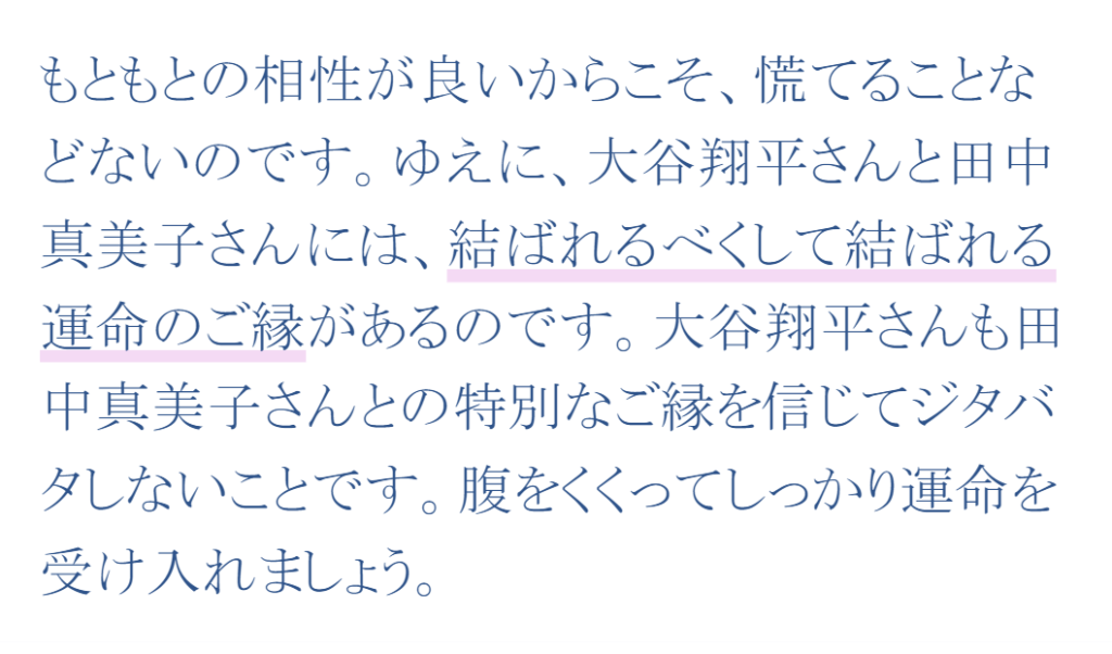 もともとの相性が良いからこそ、慌てることなどないのです。ゆえに、大谷翔平さんと田中真美子さんには、結ばれるべくして結ばれる運命のご縁があるのです。大谷翔平さんも田中真美子さんとの特別なご縁を信じてジタバタしないことです。腹をくくってしっかり運命を受け入れましょう。
