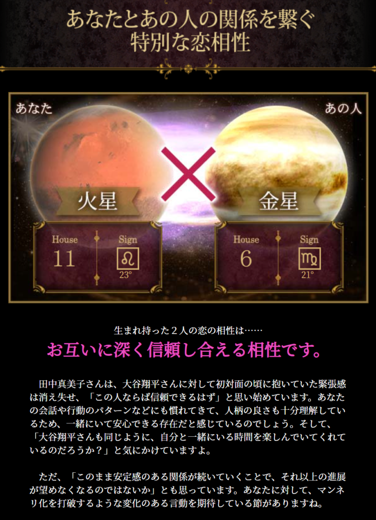 2人の中心星を見ると、大谷翔平さんと田中真美子さんは互いにパートナーとして申し分のない相性であることがわかります。慎重で繊細なあの人と、共感力が高く気遣いのあるあなたは、一緒にいて自然に心が埋め合える抜群の相性です。誰よりも理解し合える相手ですから、時には友人として、また時には恋人として、互いの存在を求め合う事になっていきます。