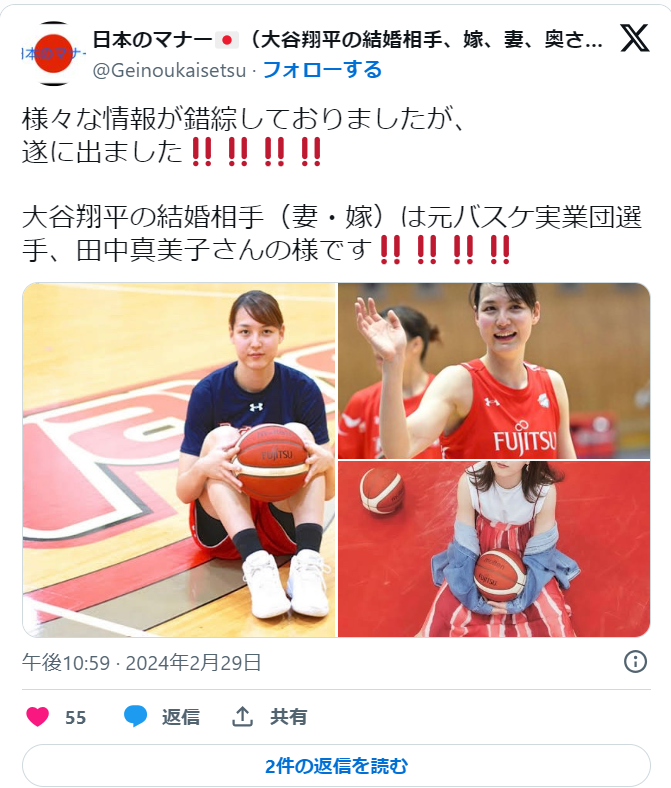 ということは、大谷翔平選手の結婚相手は田中真美子さん??