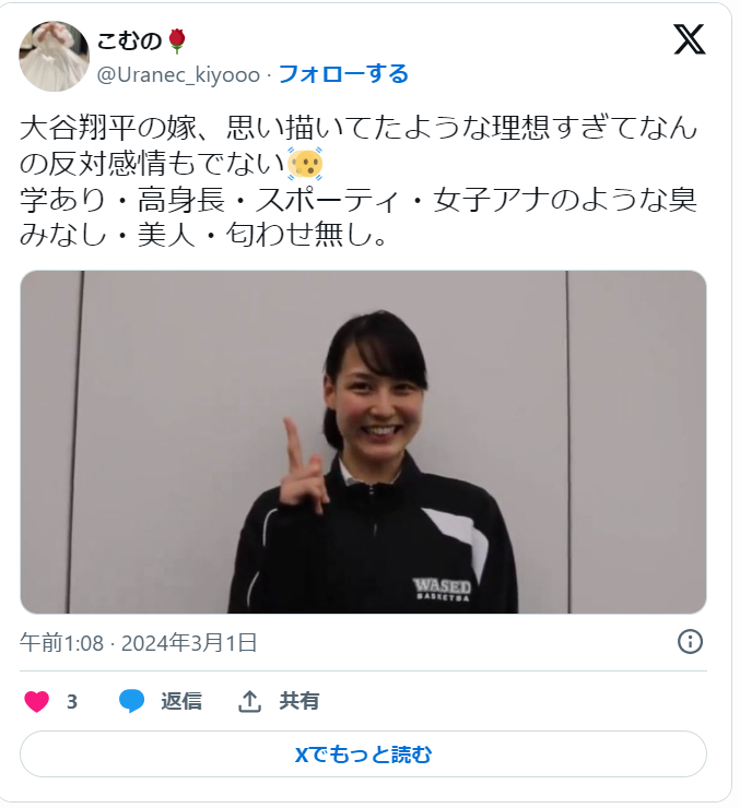 「元女子バスケットボール選手のA子さんです。小学校から運動をはじめ、中学からバスケを始めたという筋金入りのスポーツ女子で、身長180センチ台の名門私立大学出身。世界を舞台に活躍した経験もあり、モデルのような活動したこともあります。大谷選手が語ってきた好きなタイプにぴったり一致します。