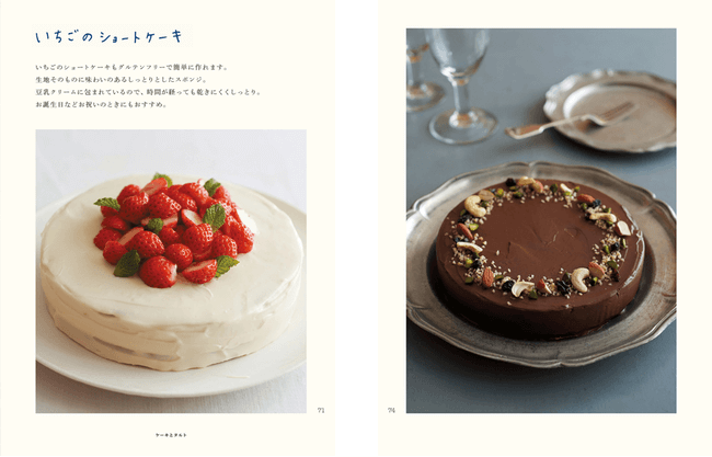 小麦粉の代わりに米粉、砂糖の代わりにてんさい糖やメープルシロップ、油は植物性を使用して、バターや生クリームを豆乳や豆乳ヨーグルトで代用しているとのことです。