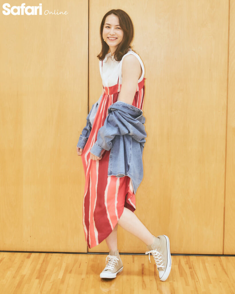 腰に巻いたデニムの着こなしがおしゃれですね。